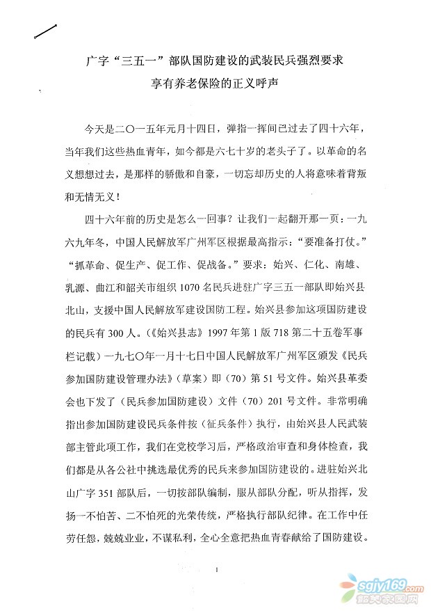 廣字"351"部隊國防建設(shè)的武裝民兵強(qiáng)烈要求享有養(yǎng)老保險的呼聲